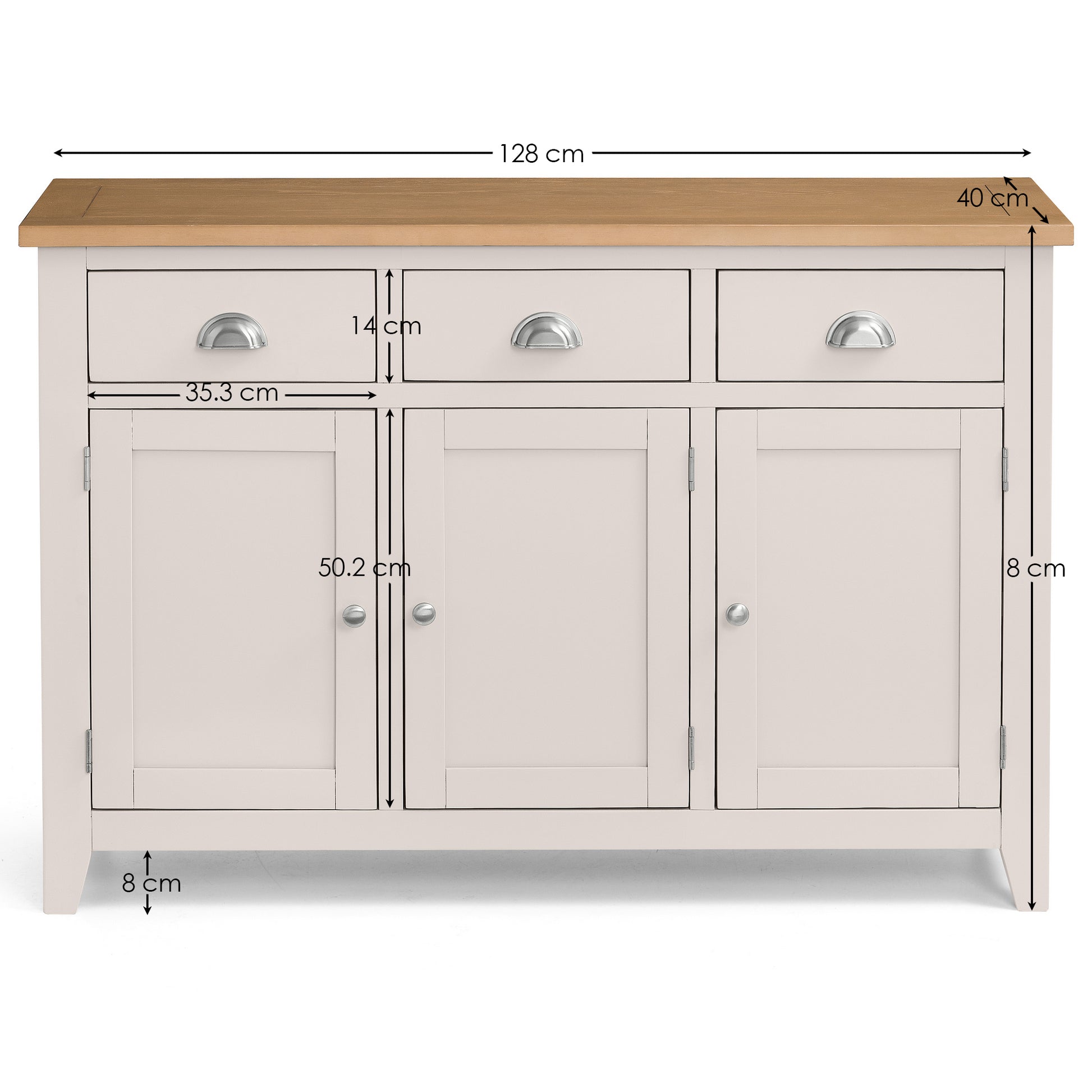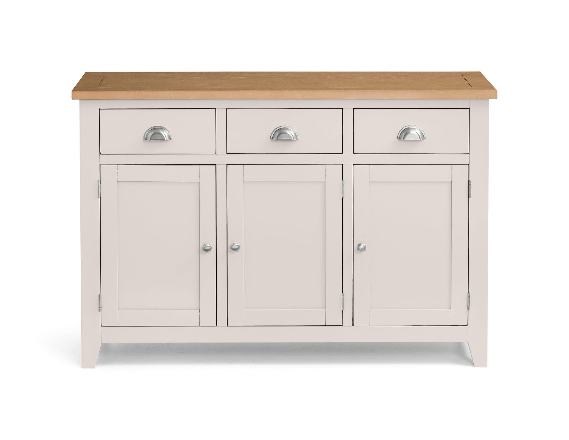 Elevate your dining and living spaces with the Richmond Sideboard, a refined fusion of soft Elephant Grey paint and a warm Pale Oak top. Crafted from high grade White Oak solids and veneers, this sideboard delivers timeless elegance with modern practicality.