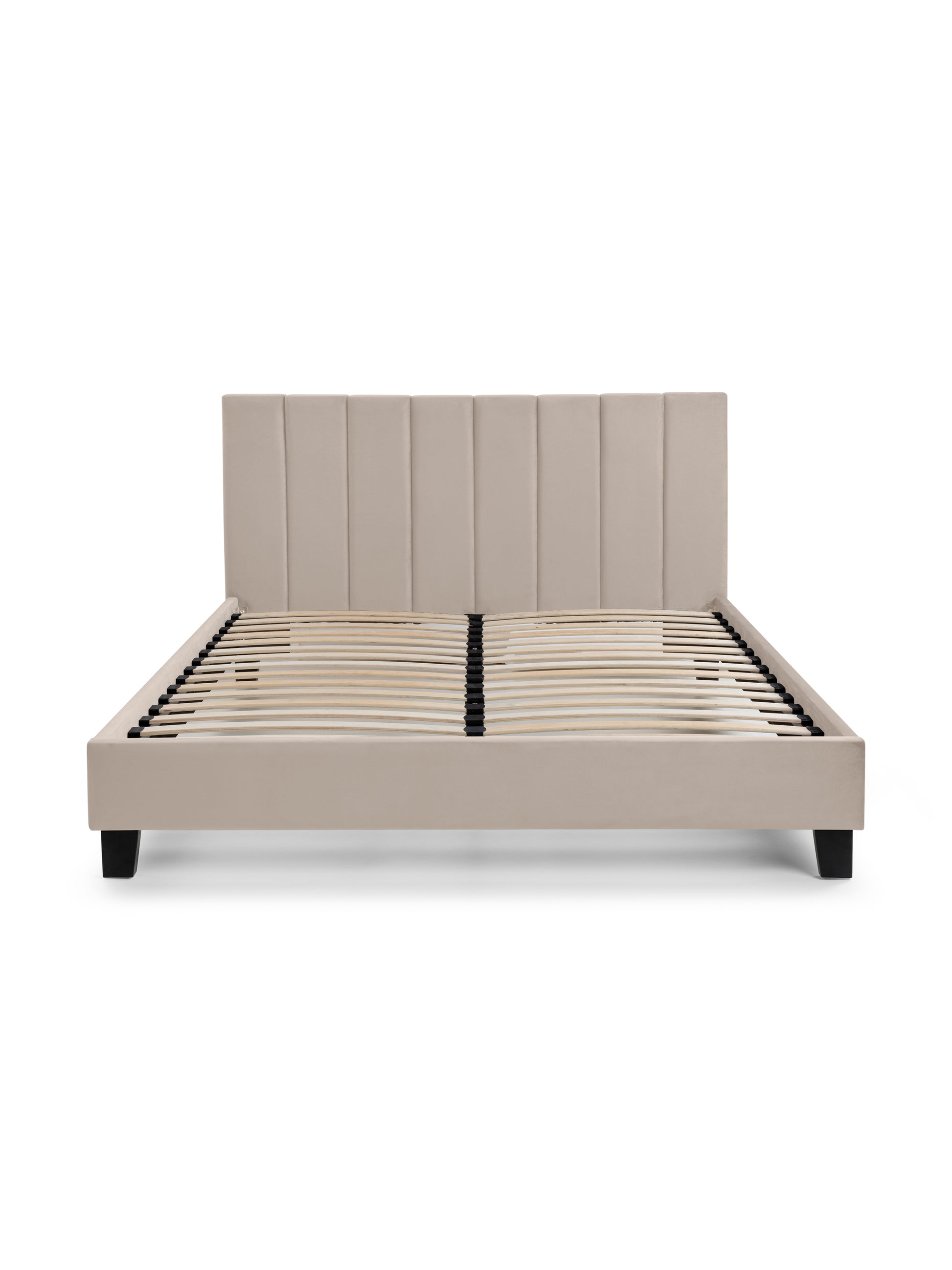 Bring soft sophistication to your bedroom with this beautifully upholstered cream velvet bed frame. The gently padded headboard features vertical panelling for an elegant touch of texture and detail. Finished with modern black legs and a low-rise frame, this bed blends comfort with refined simplicity, making it ideal for smaller spaces or guest rooms. Minimal assembly required. Mattress sold separately. Fits standard 90cm single mattresses.