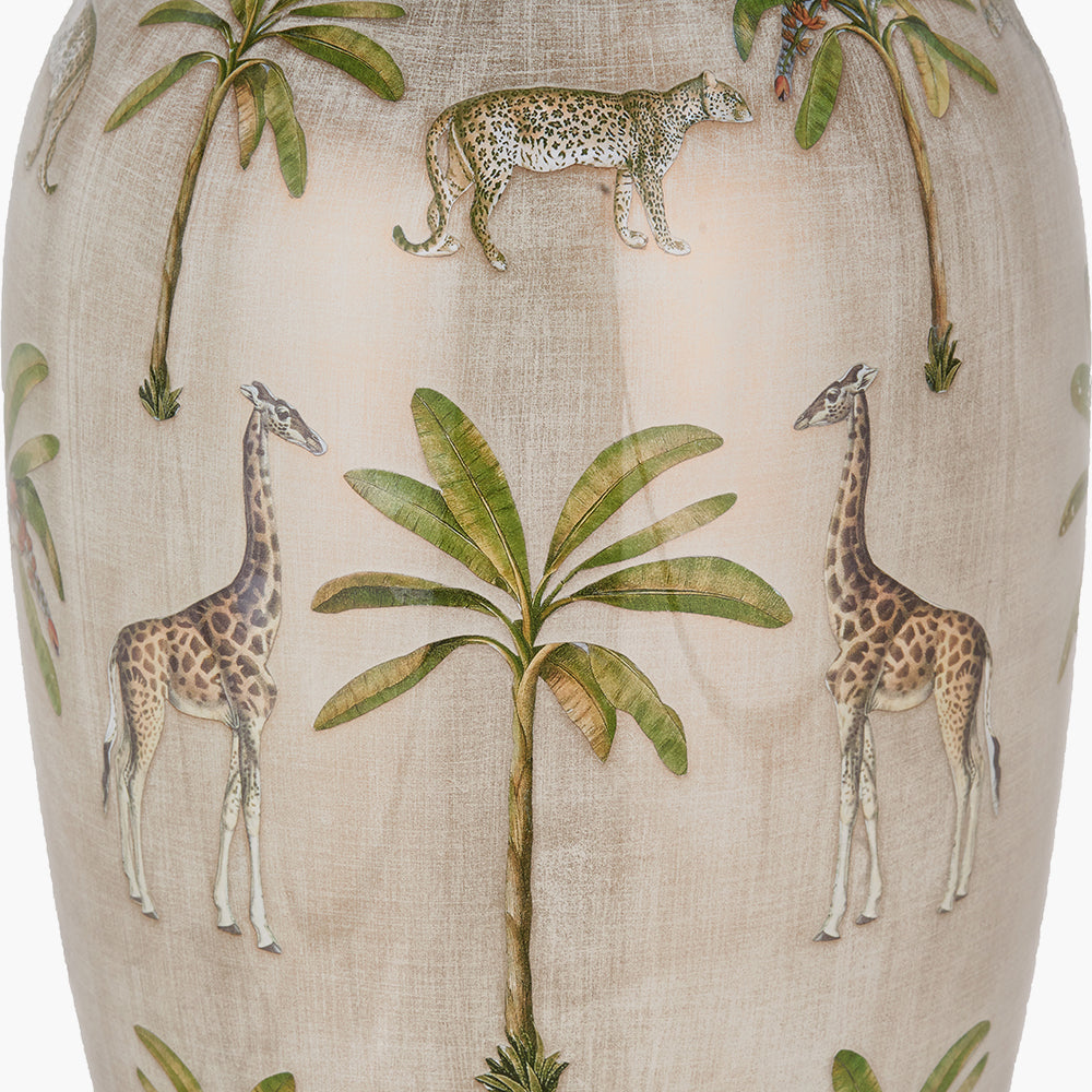 Safari Tall Glass Table Lamp Base brings a blend of artistry and ambient lighting to your space. This hand-blown glass lamp is internally decorated with skilfully cut-out antique images of African wildlife, offering a subtle narrative as it glows.