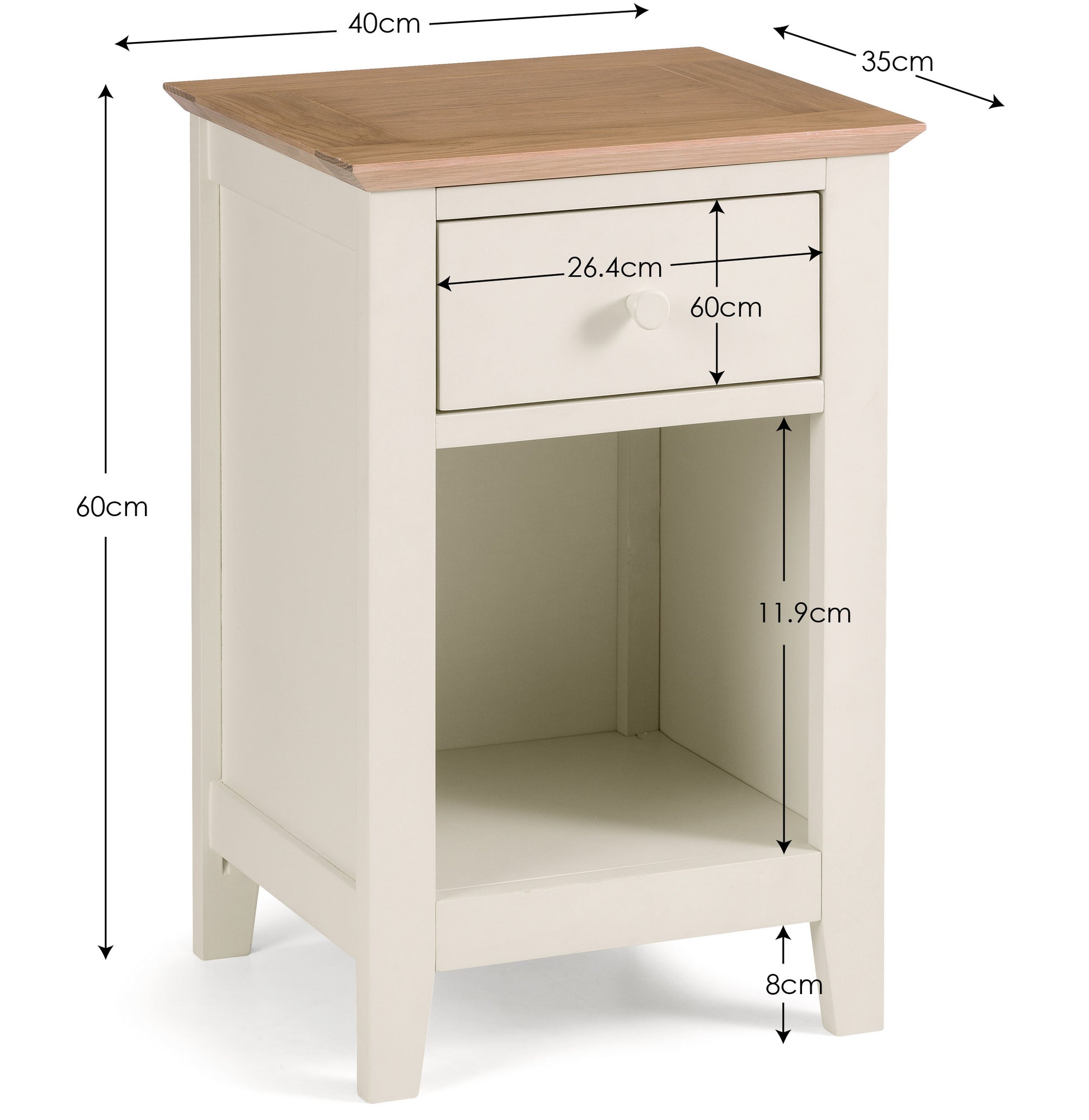 The Salerno Two-tone Ivory and Oak Bedside table is presented in the elegant Shaker style and incorporates a handy storage drawer. Its clean, simple design and compact sizing offers timeless appeal and will fit well into any bedroom space. Finished in a beautiful painted ivory with high grade White Oak veneer top, Salerno combines quality materials with robust construction into a classic design. Part of the extensive Salerno range of Beds and Bedroom Furniture in Solid Oak, Two-tone Ivory/Oak and Ivory finishes.