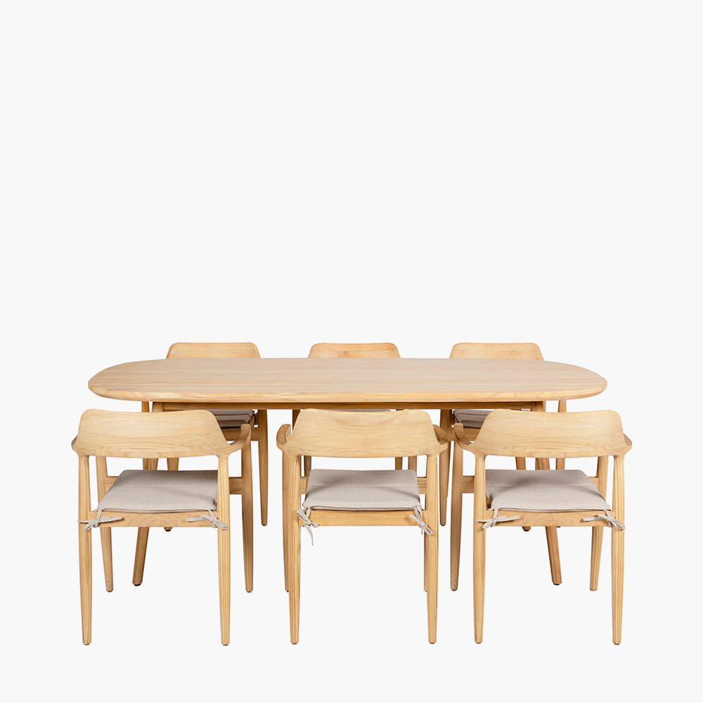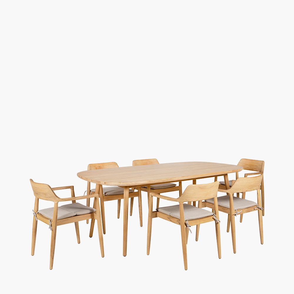 Elevate your alfresco dining with the Salita Outdoor 6 Seater Dining Set, designed to bring elegance and comfort to your outdoor gatherings. Featuring a sophisticated rounded rectangular dining table paired with beautifully crafted curved back chairs, this set is perfect for family dinners, garden parties, or simply enjoying the sunshine.