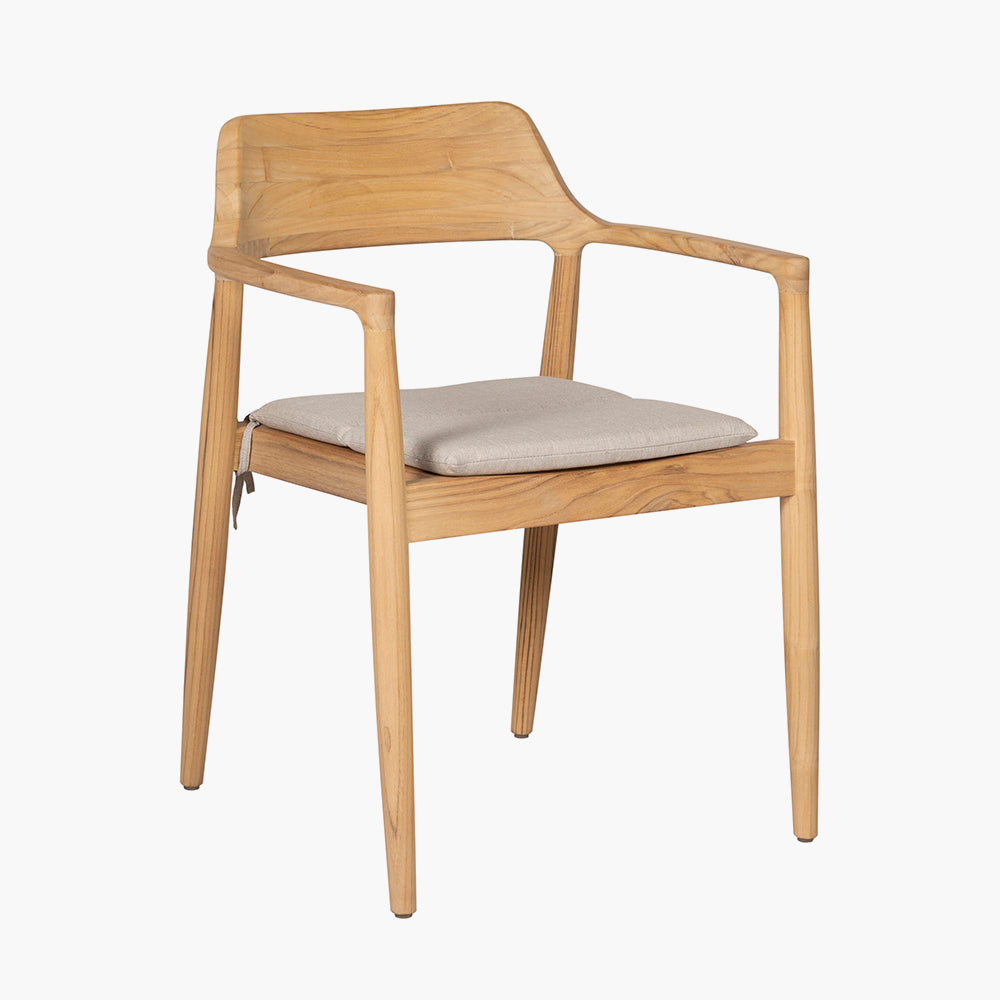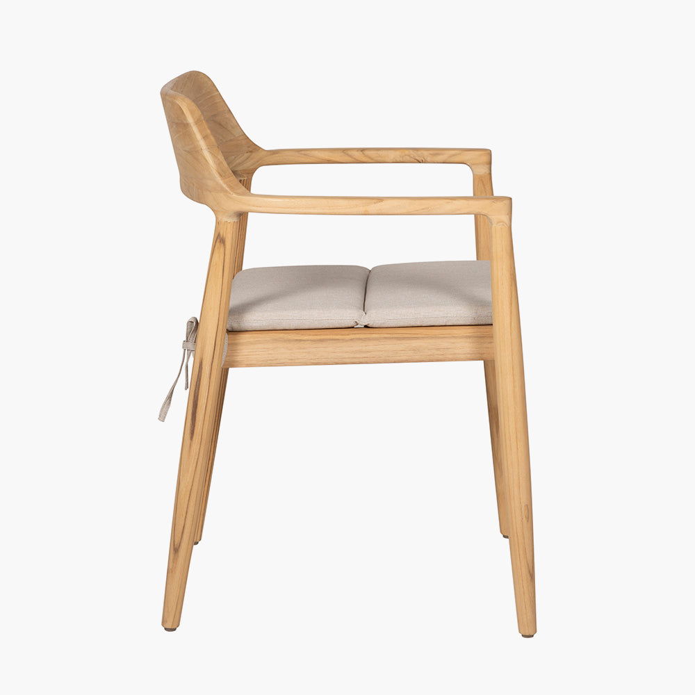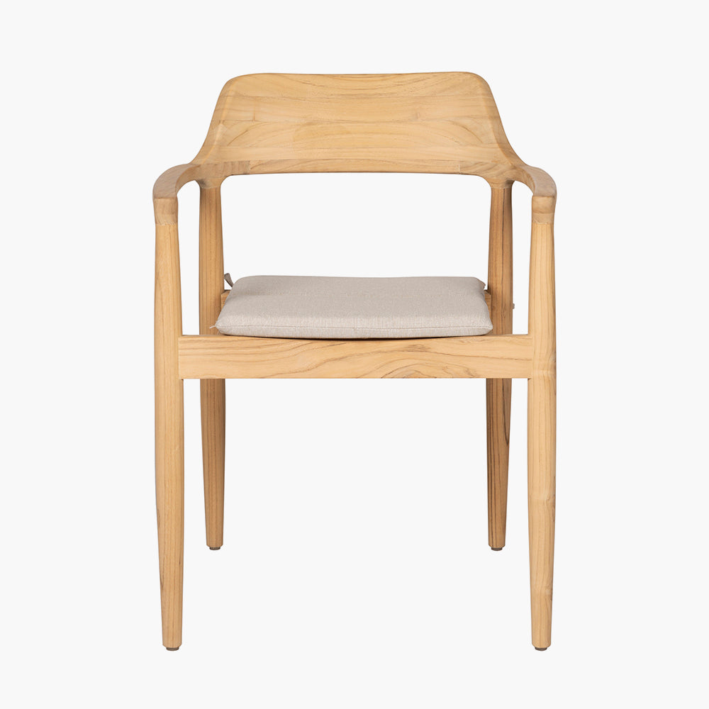 The set includes a beautifully crafted rectangular dining table, with soft curved edges, and eight curved-back chairs, all constructed from natural teak wood. The warm tones of the teak are perfectly complemented by cushions in a light linen natural oatmeal hue, upholstered in Olefin fabric, a premium synthetic fibre known for its durability. Olefin is season-proof, resistant to stains and fading, and quick-drying, making it ideal for outdoor use.