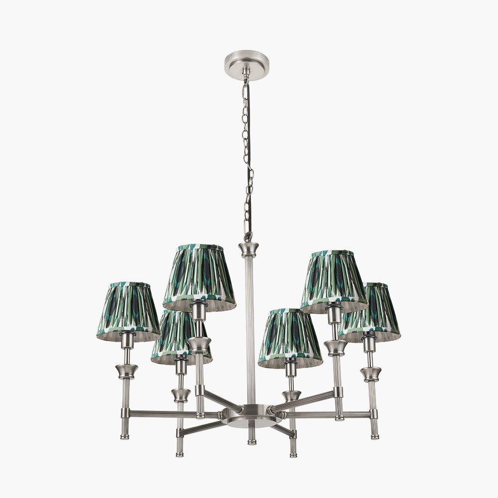 Introducing the Salvatore Antique Silver Metal 6-Arm Pendant, a versatile addition to your home d����cor that suits both contemporary and traditional settings. Handcrafted in India, its antique silver finish and ribbed detailing add a touch of elegance to any space. This stunning pendant is perfectly topped off with six cotton gathered, tapered lampshades adorned with a stunning Ikat pattern in a colour palette of greens.