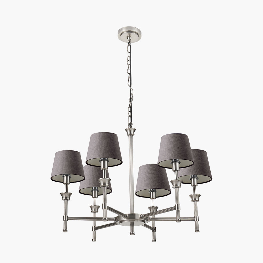 Introducing the Salvatore Antique Silver Metal 6-Arm Pendant, a versatile addition to your home d����cor that suits both contemporary and traditional settings. Handcrafted in India, its antique silver finish and ribbed detailing add a touch of elegance to any space. This stunning pendant is perfectly topped off with six luxurious grey open-weave cotton lampshades to complete the look.