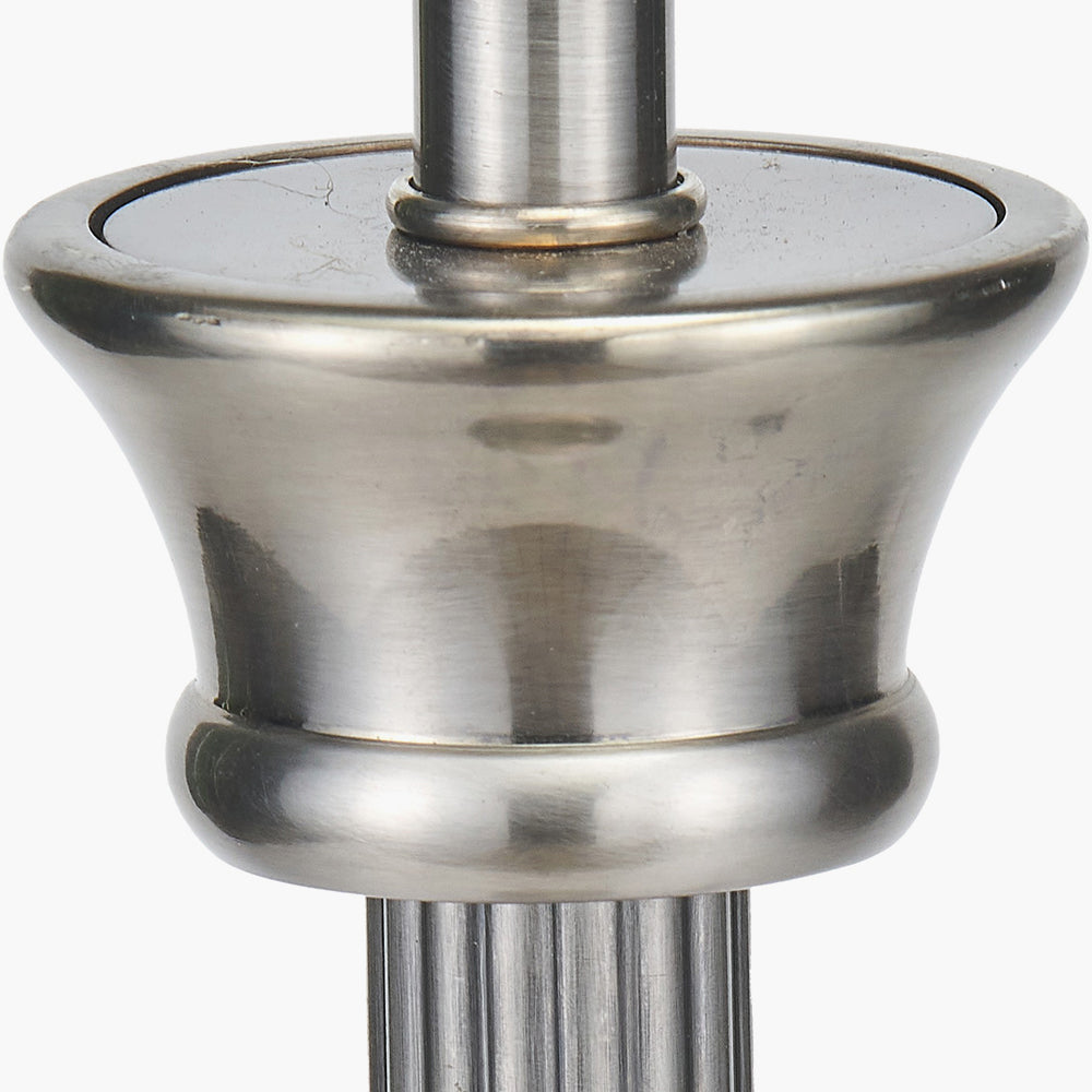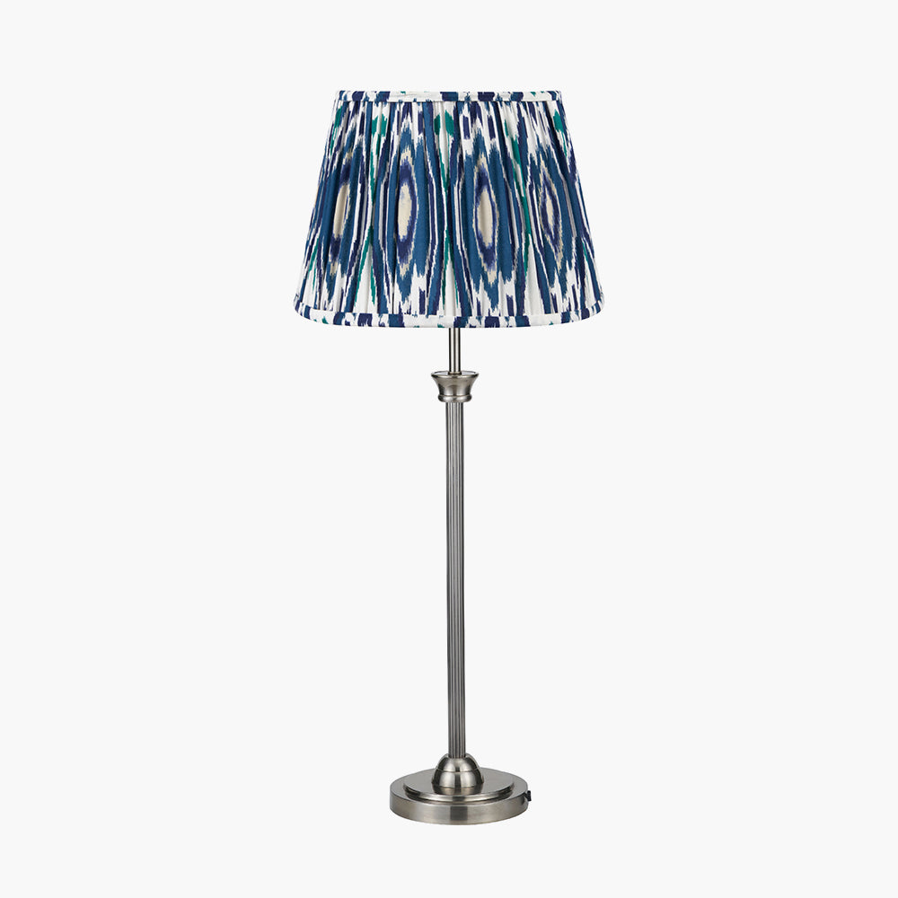Add a touch of style to your decor with our traditional, yet contemporary antique silver metal table lamp base. The stunning table lamp base, which has been lovingly crafted in India, features a sleek column, with intricate ribbed detailing and a stepped base. Paired with a cotton gathered, tapered shade adorned with a stunning Ikat pattern in a colour palette of blue and natural, this table lamp will most certainly make a statement.