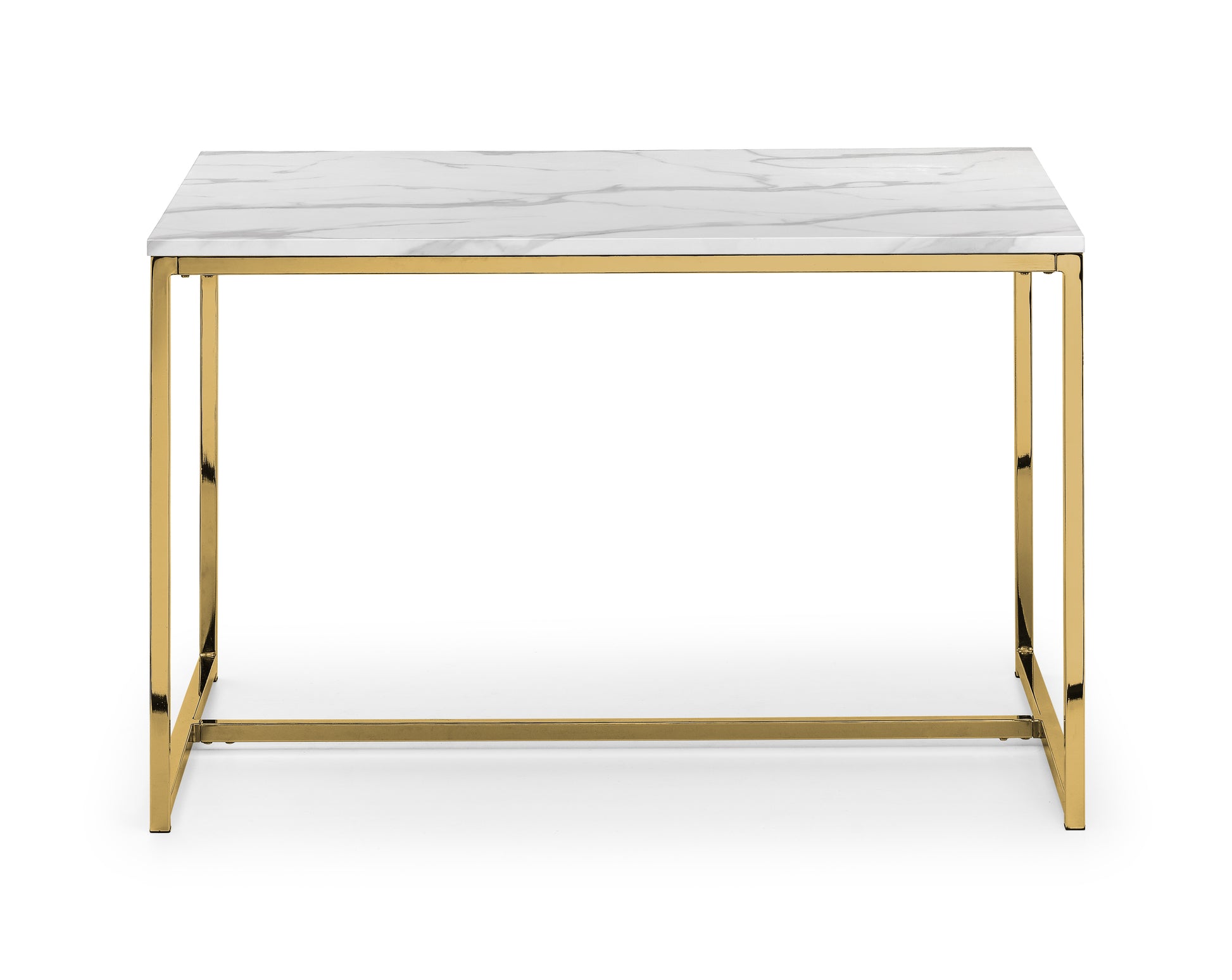 Scala is a sleek dining table with chic marble effect top on a well-crafted gold coloured, stainless steel frame. It has a timeless Italian design that fits well with a wide range of decorative styles. Part of the Julian Bowen Scala Dining and Occasional furniture range.