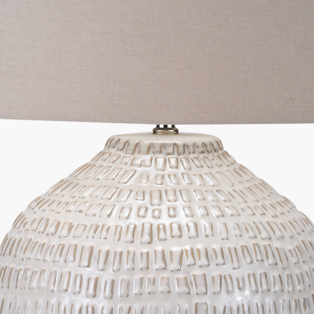 Elevate your space with our Signe Warm White Linear Textured Ceramic Table Lamp. The ceramic table lamp base has an intricate square design, oozing style and offering a tactile finish. Topped with an natural coloured cotton effect shade, this statement piece will bring a welcoming ambiance to any room in your home.