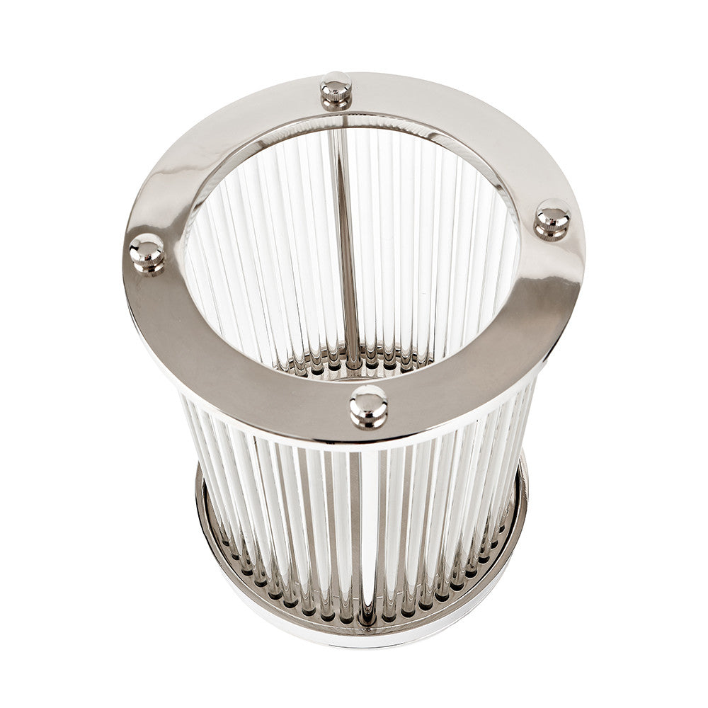 This beautiful glass straw and shiny silver metal hurricane will add a subtle hint of art deco style and atmosphere to any living space once filled with a pillar candle. Available in 2 sizes and 2 finishes, this hurricane will stand the test of time with its classic yet contemporary design.