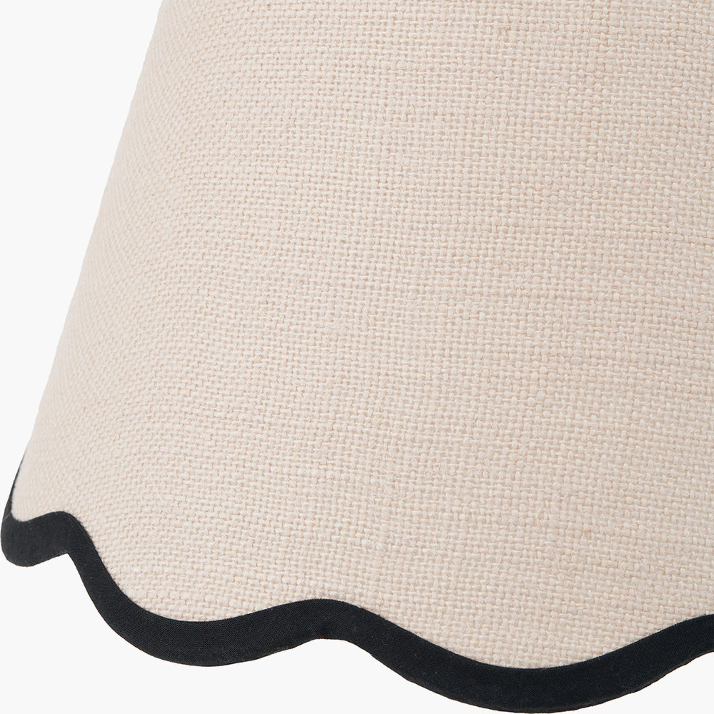 The Tabitha 25cm lampshade is a beautifully crafted cream jute tapered shade with a scalloped edge. Its elegant silhouette and textured finish are further accentuated by a black contrast binding, creating a timeless look that draws the eye��������making it the perfect statement piece for any lamp base.