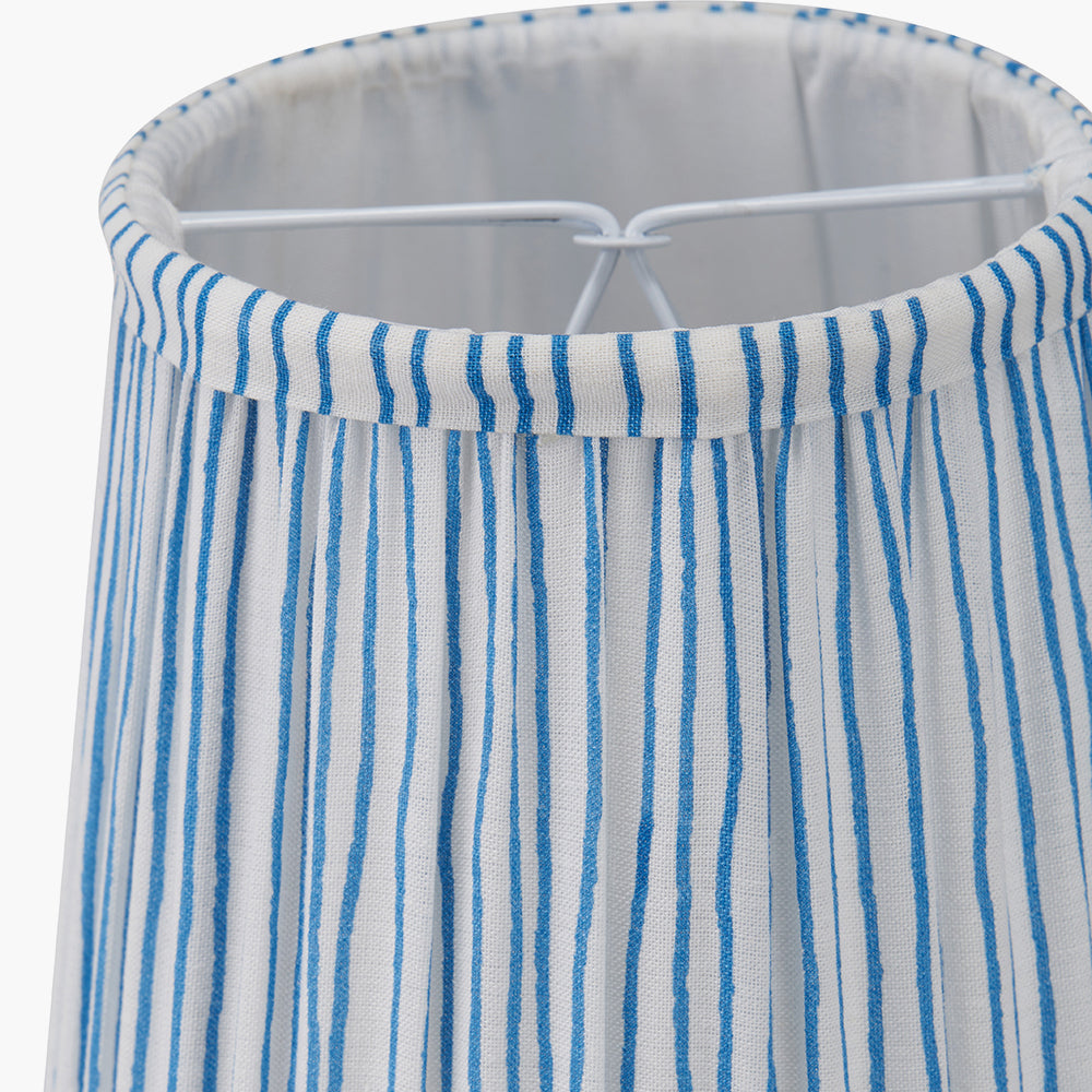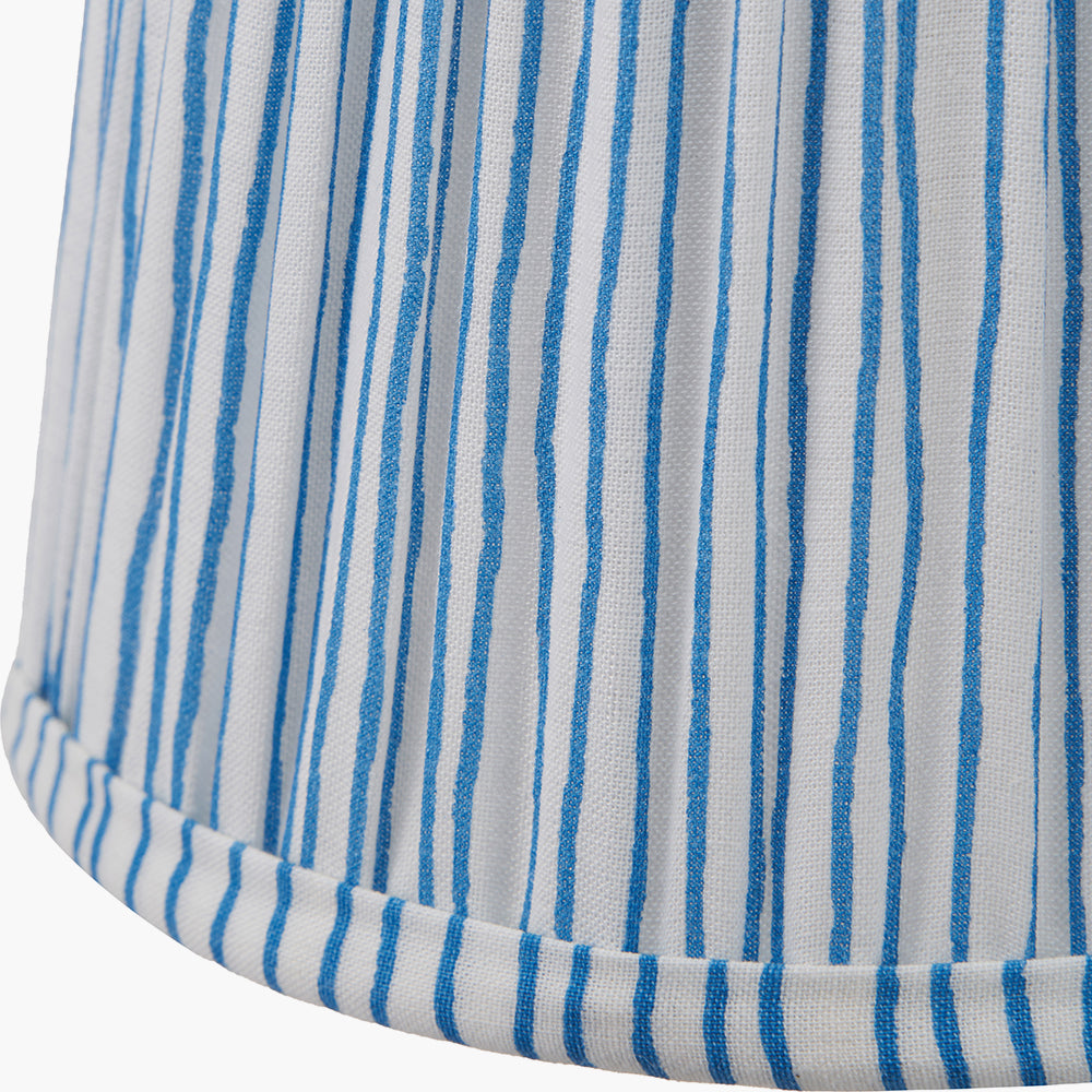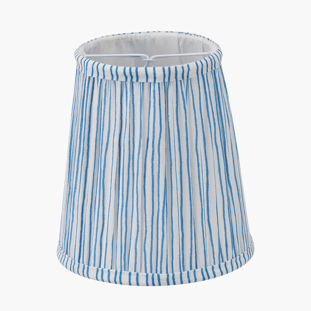 The Thiago 14cm cotton gathered mushroom pleat, tapered lampshade features a striking stripe pattern, in a colour a palette of blue and white. The stunning lampshade features a 'candle clip' fitting, attaching to the to the bulb, where a smaller shade is required.
