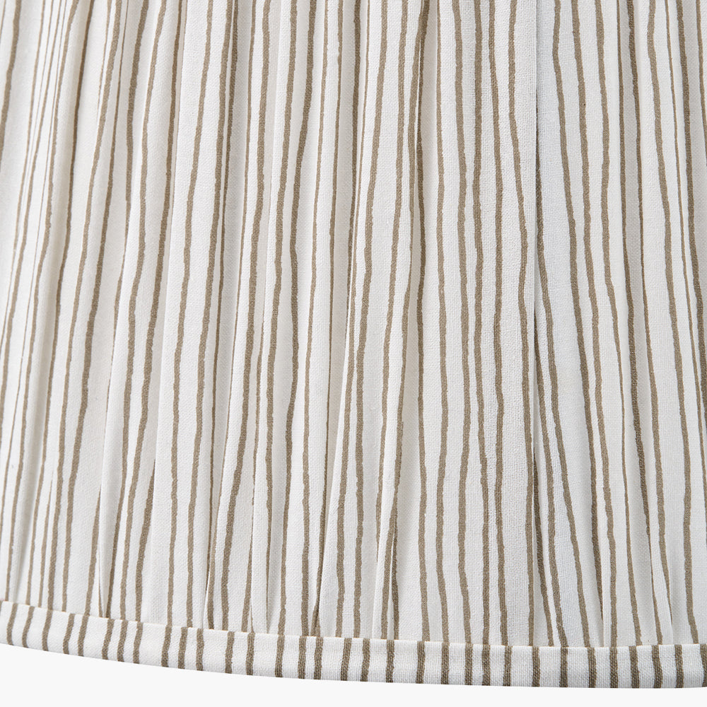 The Thiago 40cm cotton gathered mushroom pleat, tapered lampshade features a striking stripe pattern, in a colour a palette of natural and white. The stunning lampshade will look great on a multitude of bases. This lampshade features a reversible gimbal, allowing it to be used with either a table or floor lamp base, or reversed for use as a ceiling pendant.