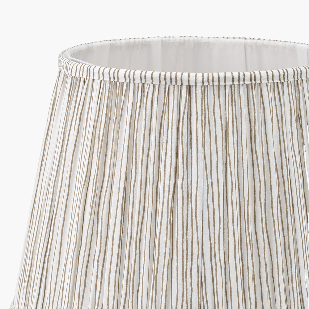 The Thiago 40cm cotton gathered mushroom pleat, tapered lampshade features a striking stripe pattern, in a colour a palette of natural and white. The stunning lampshade will look great on a multitude of bases. This lampshade features a reversible gimbal, allowing it to be used with either a table or floor lamp base, or reversed for use as a ceiling pendant.
