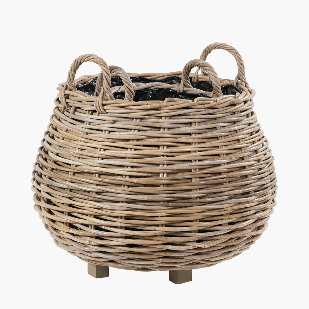 Elevate your interior or exterior space with our tobs�� luxurious set of 2 Kubu rattan bulbous basket planters. Handcrafted in Indonesia, they feature a high-quality woven design in a soft grey hue. The plastic lining and wooden base provide durability and protection against the elements. Create a small hole in the plastic liner if using the rattan basket planters outside for drainage and longevity. Add elegance and sophistication to your home, garden, or patio.