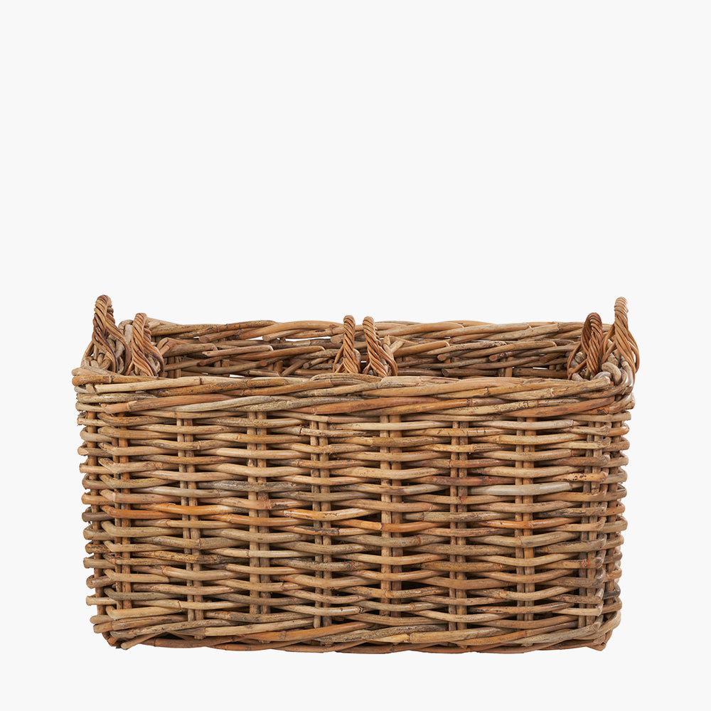 Elevate your home with our set of 3 chunky rattan storage baskets. Handcrafted in Indonesia from heavy gauge, natural-coloured rattan, these versatile baskets will add a touch of rustic charm to any room within your home. The large tobs�� rattan basket is the perfect size for storing logs, blankets, or other household items, while the 2 smaller-sized baskets are ample size to store magazines or toys, and can be stored inside the larger basket when not in use.