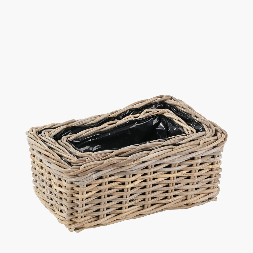 Elevate your floral display with our tobs�� set of 3 woven Kubu rattan basket planters. The indoor/outdoor baskets, crafted in Indonesia, are made with a plastic lining for easy planting, in a stylish soft grey hue, in 3 different sizes offering endless planting possibilities. Embrace rustic charm and add a touch of individuality to your garden.