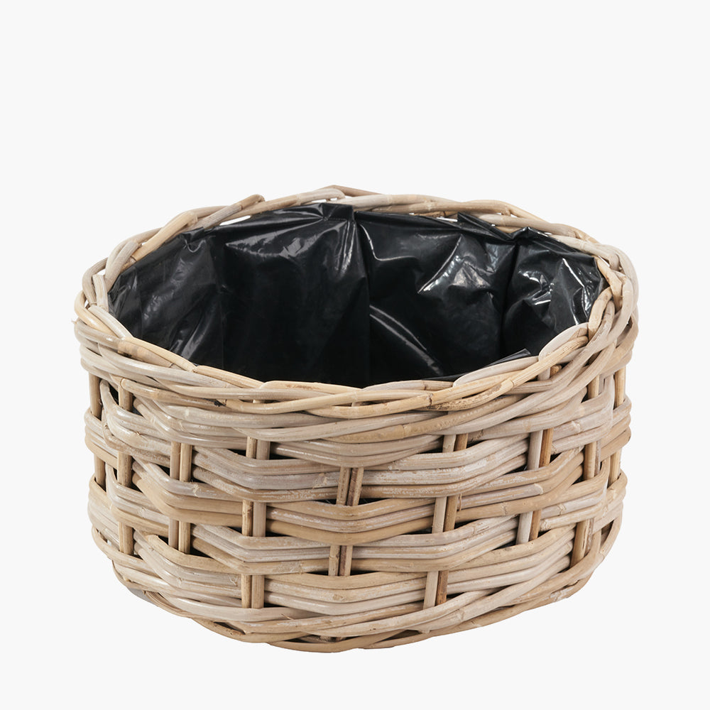 Elevate your home or garden with our tobs�� S/3 Indoor Outdoor Grey Kubu Rattan Triple Weave Round Rattan Storage Basket Planters. Handcrafted in Indonesia, the triple weave design, in a soft grey hue exudes rustic charm while providing a perfect home for your favourite blooms. The plastic lining ensures hassle-free planting, preserving the planter's pristine appearance.
