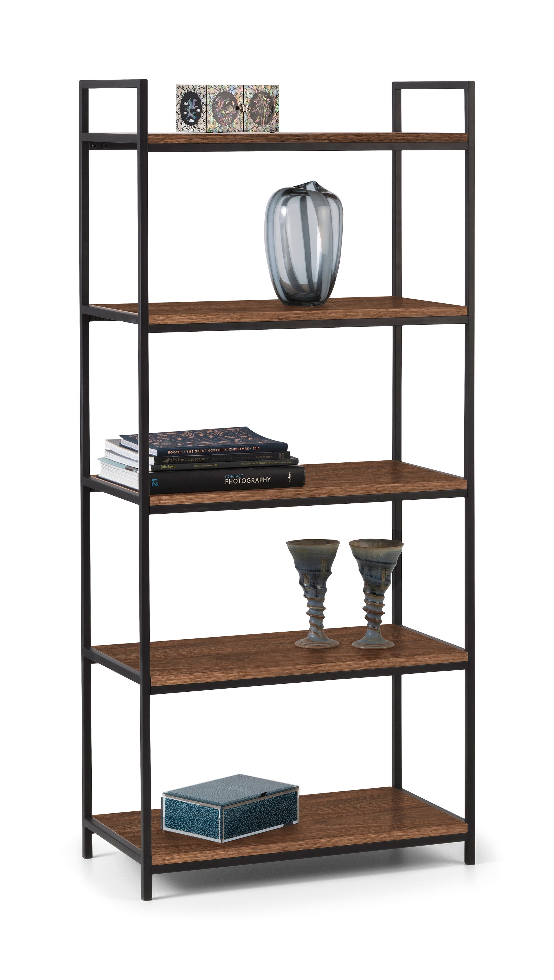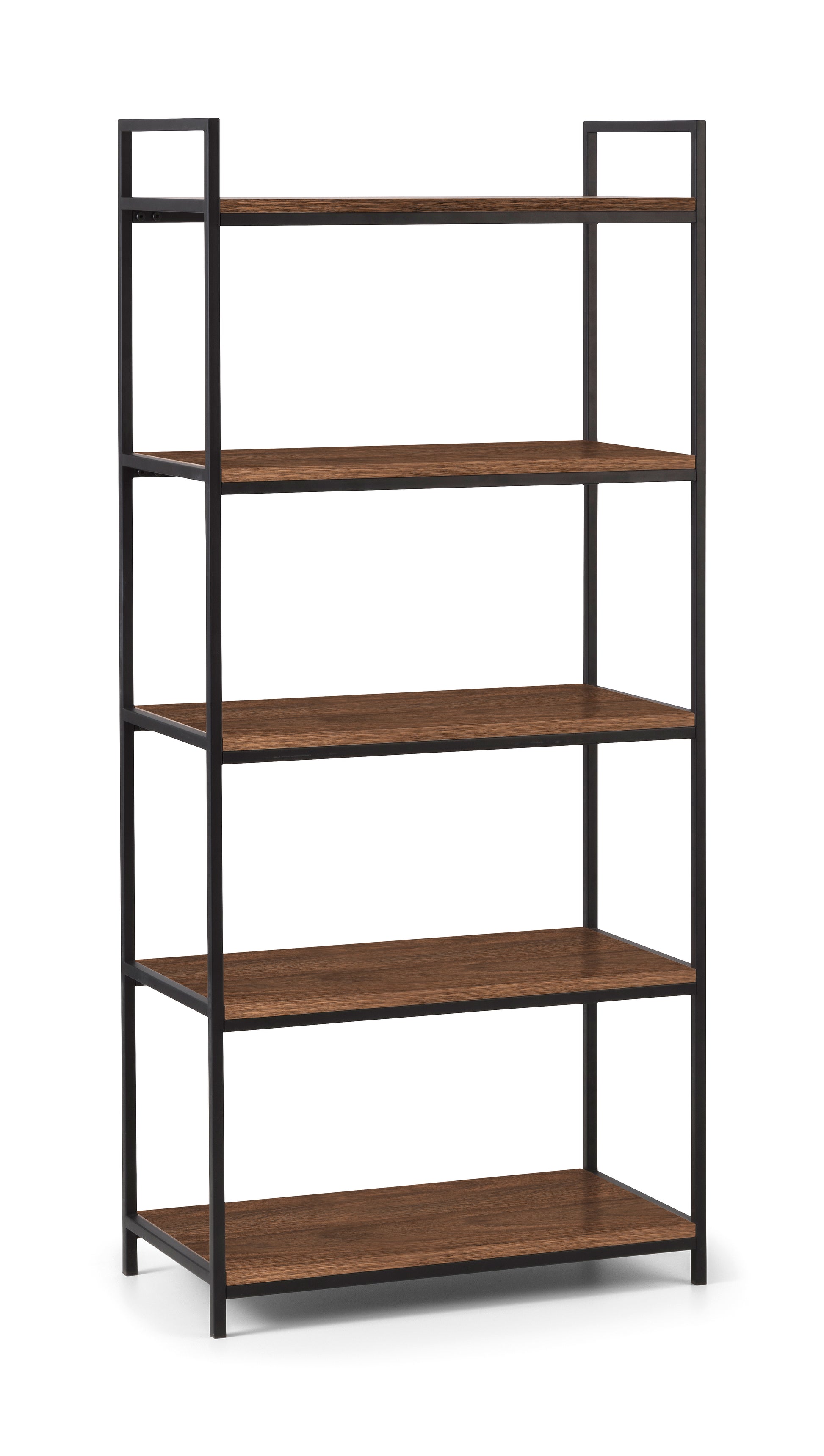 Five shelves offer generous storage and display space for books, decor, and essentials, while the combination of walnut foil and a black metal frame delivers a balanced look that is both warm and refined.