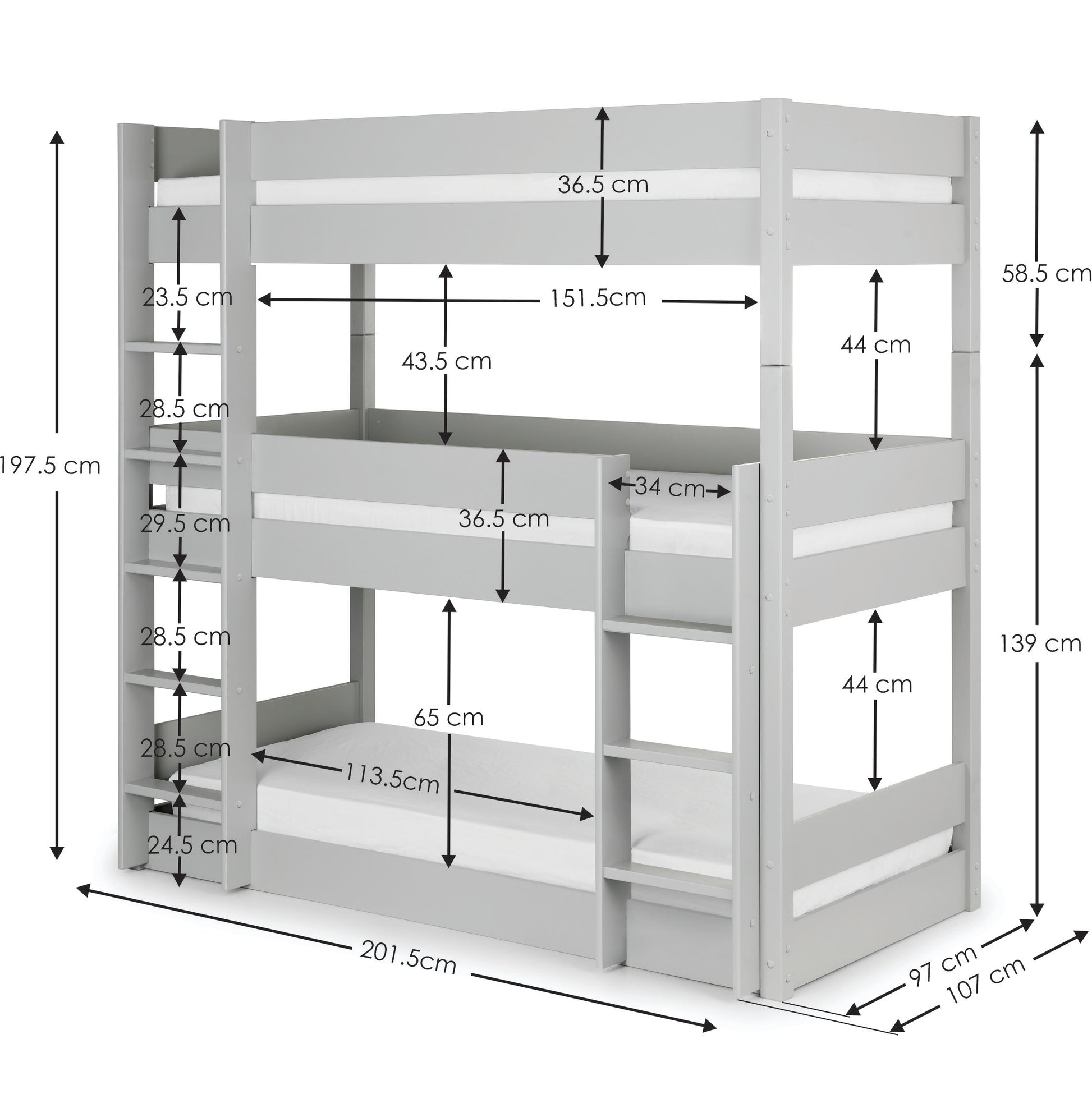 Accommodating 3 children whilst only using the space of one single bed, the Trio bunk bed is the perfect solution for those short on space in smaller bedrooms. Ideal for sleeping siblings, or regular sleepovers the durable Trio Bunk is finished in a stylish grey, matching any bedroom decor. Crafted from solid pine and MDF, this safe and sturdy design is essential for maximising space.