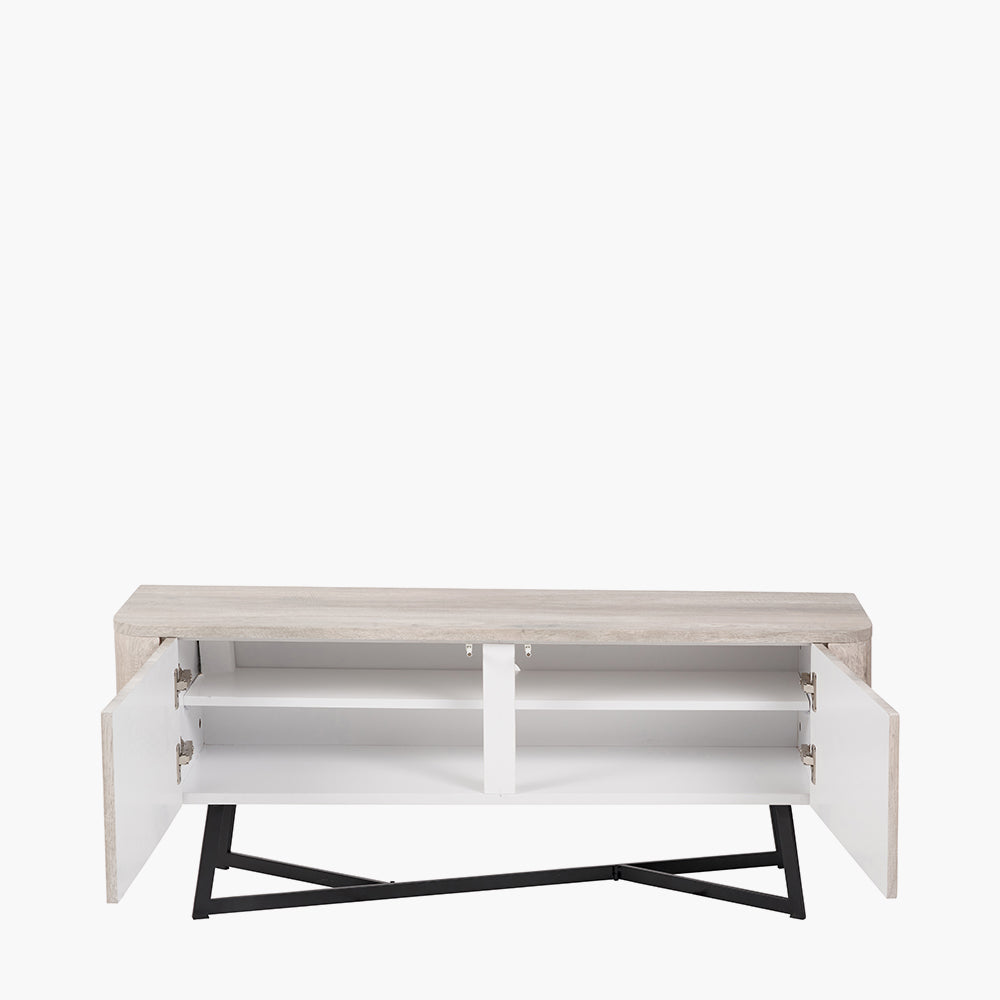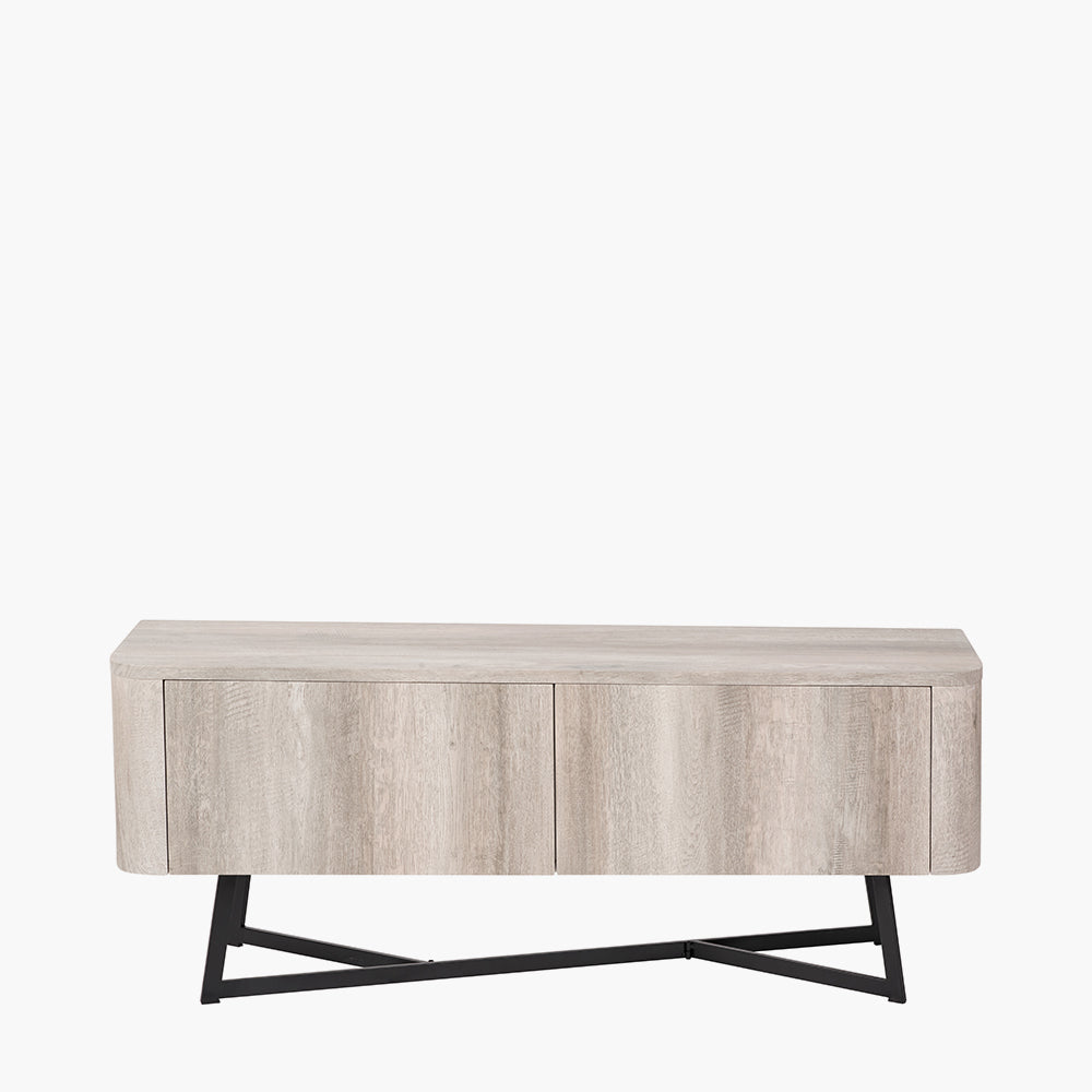 Elevate your home decor with the Ukiah Grey Oak Veneer and Black Metal 2 Door Low Unit, where modern aesthetics meet unparalleled functionality. This stunning low unit is designed to enhance your living space while providing practical storage solutions.