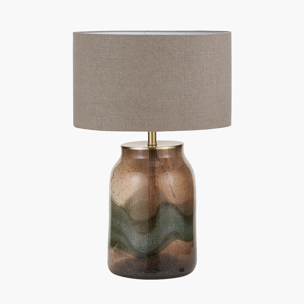 Enhance the ambiance of your space with this exquisite hand-blown brown and green glass table lamp base. The table lamp base, with a bubble finish and green design inherent in the glass, is a stunning work of art, while the gold metal plate elevates its elegance. Topped off with a beautifully rustic open weave jute linen cylinder shade in a natural hue to complete the look.