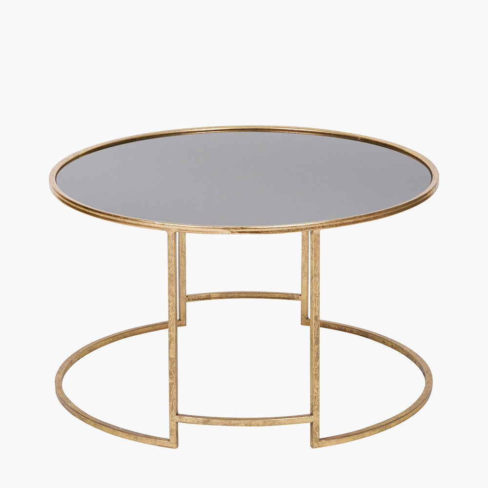 Crafted with a luxurious antique gold leaf effect metal frame and a sleek black glass table top, this coffee table is not only a functional furniture piece but also a captivating centerpiece that sparks conversation. Its round design enhances the flow of your space, ensuring that it complements any arrangement effortlessly.