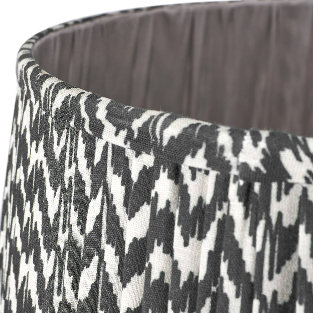 Featuring an in house curated print and reminiscent of the ikat style this tapered geo print is finished in a black colour and hand mushroom pleated to add a soft edge to the linear design. The 30cm shade is in a tapered profile and helps create a modern/classic look. Some larger shades within this range feature a reversible gimbal, suitable for table, floor, or ceiling use. Contact our Customer Support Team to confirm sizing and availability
