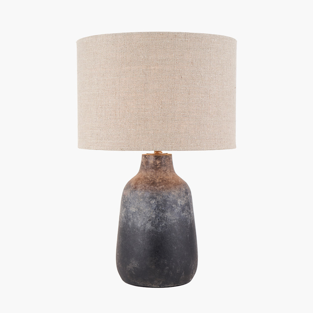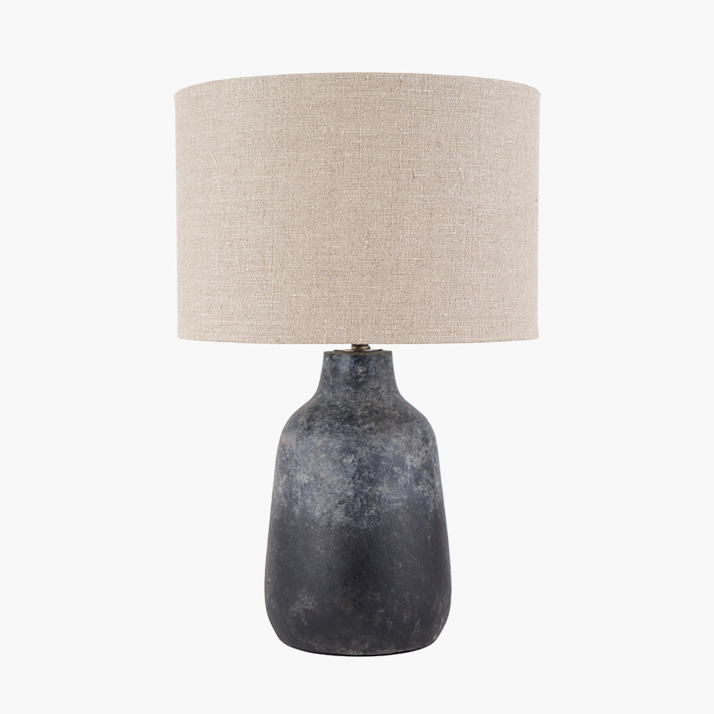 This bottle-shaped, concrete effect stoneware table lamp is handmade in the Philippines and has a textured finish giving it a super contemporary feel whilst retaining an artisan look. Topped with a beautifully rustic open weave jute linen cylinder lamp shade that finishes this lamp base perfectly.