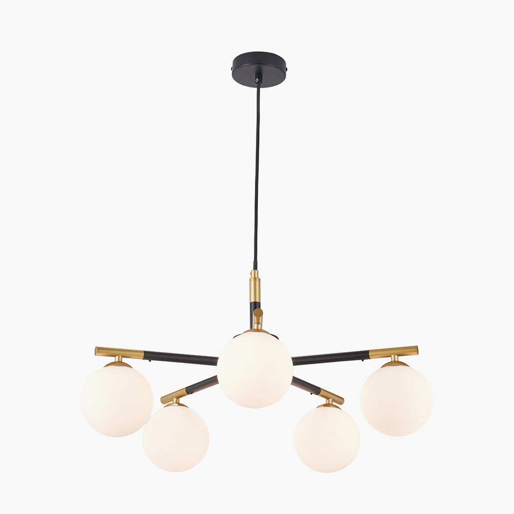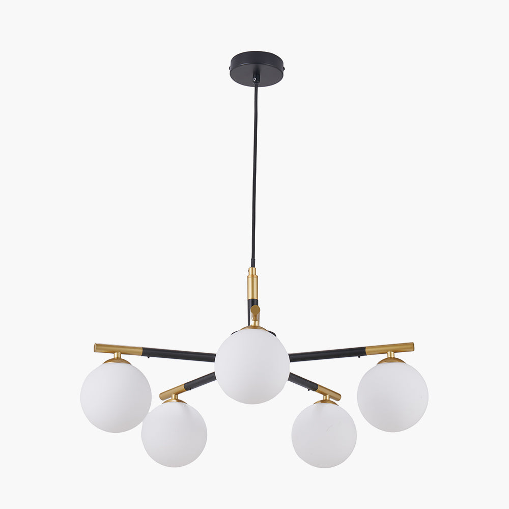 A striking electrified pendant with 5 white glass balls on a black metal frame with gold metal accents offers a contemporary style perfectly. The circular pendant would create a statement above a dining table or as a focal point in your room.