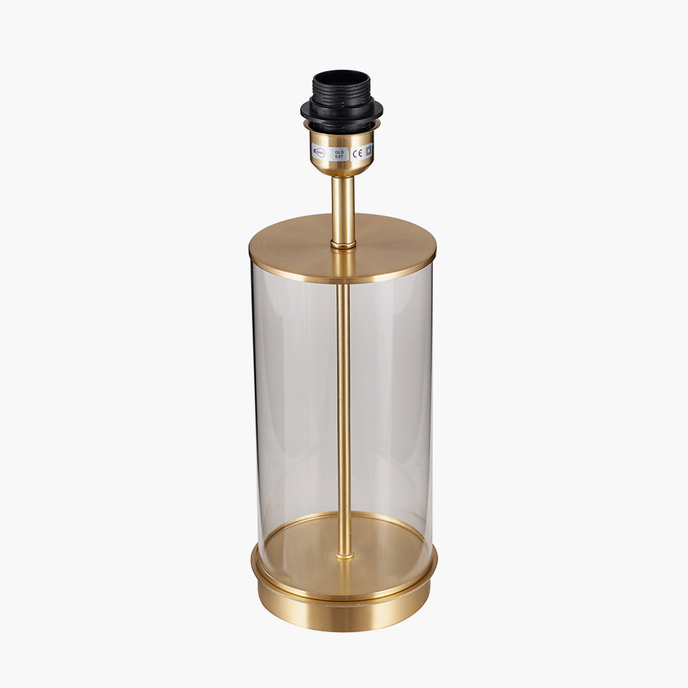 Introducing the Westwood Clear Glass and Champagne Metal Table Lamp Base with Harry 35cm Ivory Cotton Mix Cylinder Lampshade—a stunning addition to any home that effortlessly combines style and functionality.