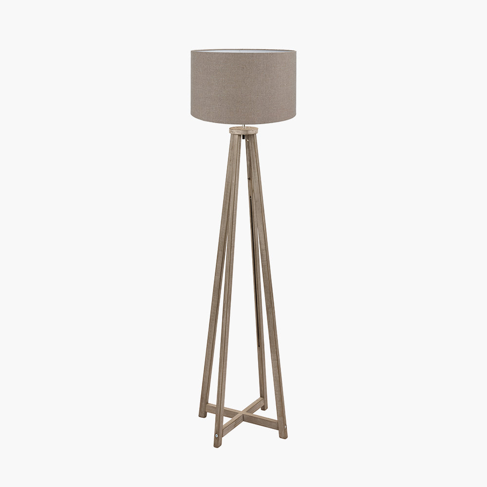 Simply stylish, the Whitby wood Floor Lamp has four tapered wooden legs and an elegant criss cross detail at the base. The slender profile and neutral washed grey wood is a match for most decor. The grey floor lamp base looks fabulous with the beautifully rustic open weave jute linen cylinder lamp shade.