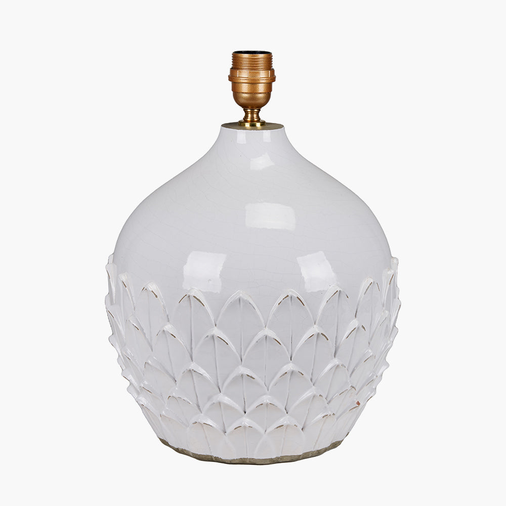 A delicately curved terracotta pot which has been finished in a crackle white finish. Adorning the bottom half of the pot are textured 3D leaves which have been lovingly hand crafted and added one by one making each piece truly unique. To highlight these beautiful leaves a light distressing has been added to the edges. This elegant table lamp is finished with an open weave jute linen pistachio tapered lamp shade, that allows the light to softly filter through the weave producing a soft glow when lit.