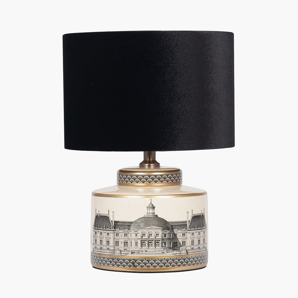 Small and compact this monochrome architectural building print is sat upon a subtle cream background making this a striking detail on this ceramic table lamp. The stylish ceramic table lamp base is complemented with a luxurious black velvet lamp shade, with metallic bronze inner, this stylish lamp is sure to make a statement in your home.