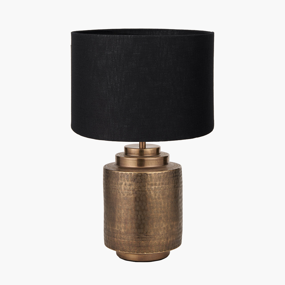 Our stylish antique brass metal table lamp is lovingly made in India. The long-standing technique of hand-hammering has been used to create this beautifully textured and charming antique brass, metal table lamp. The metal table lamp base is adorned with a modern black linen cylinder lamp shade to complete the look. The self-lined shade in an open-weave material allows the light to filter through creating an ambient glow.