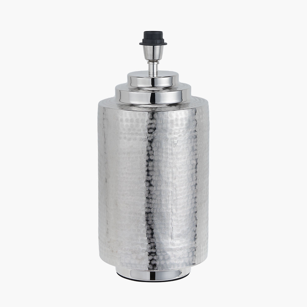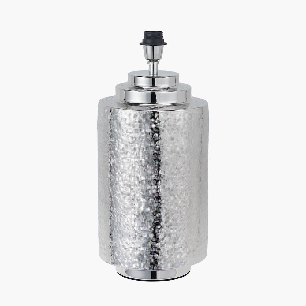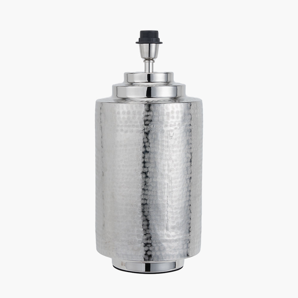 Transform your living area or workspace with the Zuri Large Shiny Silver Metal Pot Table Lamp Base, a stunning centerpiece that combines artistry with modern elegance. Crafted meticulously in India, this handcrafted lamp base showcases expert hand-hammering techniques, resulting in a uniquely textured and captivating design.