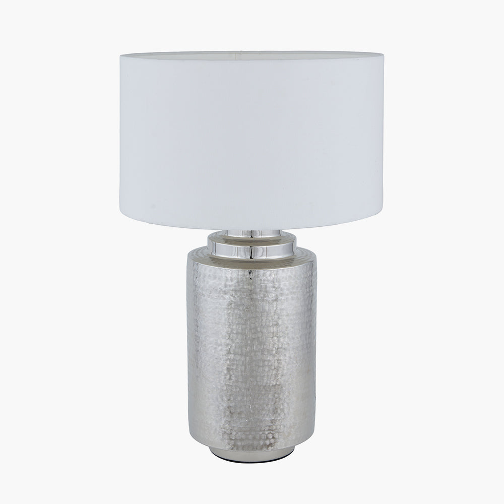 Made in India, hand-hammering has been used to create this beautifully charming, yet contemporary shiny silver, metal table lamp. The stunning table lamp base is enhanced further with the soft white cylinder lamp shade which allows the light to softly filter through the weave producing a soft glow when lit.