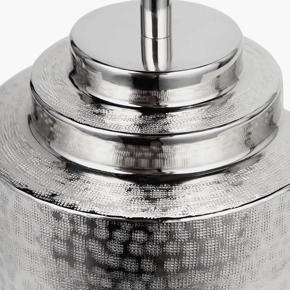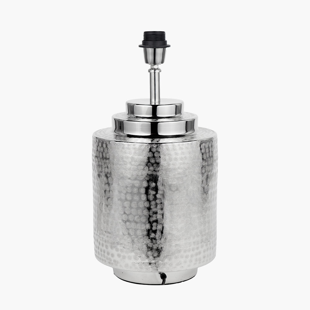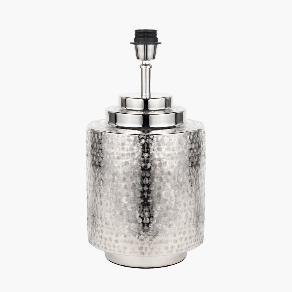 Our stylish shiny silver metal table lamp is lovingly made in India. The long-standing technique of hand-hammering has been used to create this beautifully textured and charming shiny silver, metal table lamp. Create some drama by adding one of our beautiful cylindrical lamp shades.